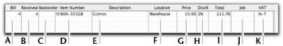 One row in the scrolling list is one line item of the transaction. You can enter as many line items for a purchase as you want. The fields that appear in the scrolling list differ according to the type of purchase you are creating.