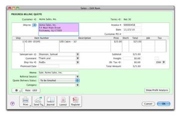 Progress Billing enables you to create an invoice from a quote by billing your customer for a percentage of the original quote or a quantity, rate, or amount for each line item.