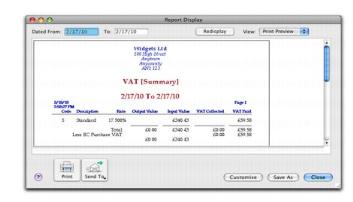 These reports total VAT transactions for each VAT code. They can cover any date range, all VAT codes or selected VAT codes. The VAT Summary report displays amounts payable and recoverable, and the VAT Summary – Cash report displays amounts actually paid and collected. An example of the VAT Summary report is shown below.