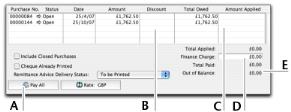 In the scrolling list in the bottom half of the window, indicate which purchases are covered by the payment by entering amounts in the Amount Applied column.