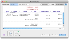 These reports show each transaction that has a VAT code applied to it for the specified date range and specified VAT codes. The reports can be filtered for one, a number, or all VAT codes. The VAT Detail report shows amounts payable and recoverable and the VAT Detail – Cash report shows amounts actually paid and collected. An example of the VAT Detail – Cash report is shown below.