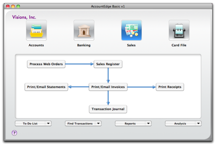 The selected icon represents the current command center, and the flowchart displayed below the icons illustrates the major tasks associated with that command center. (For example, when the Sales icon is selected, tasks such as Sales Register and Print/Email Statements—typical tasks you would complete in relation to sales—appear in the command center’s flowchart.)