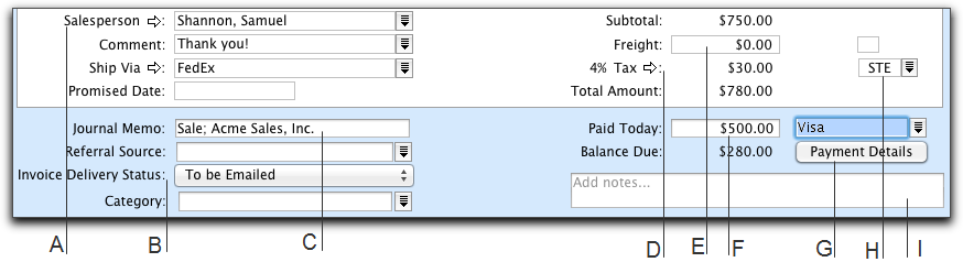 The fields that appear at the bottom of the Sales window depend on the type of sale you are creating.
