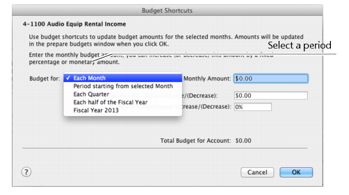 If you want to quickly enter budget figures for a group of months, you can use the Budget Shortcuts window. You can use this window to enter quarterly, half-yearly and yearly budgets. You can also enter a budget that increases or decreases by a specific amount every month.