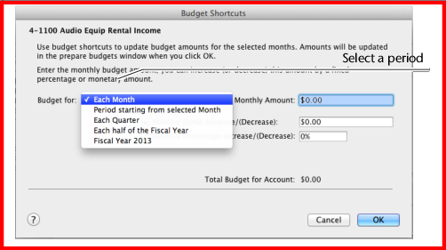 If you want to quickly enter budget figures for a group of months, you can use the Budget Shortcuts window. You can use this window to enter quarterly, half-yearly and yearly budgets. You can also enter a budget that increases or decreases by a specific amount every month.