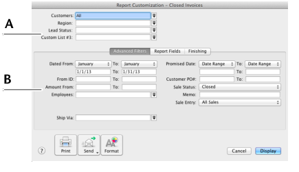 Click Customize. The Report Customization window appears. The customization options that appear depend on the report being customized. The example below shows the options available for the Closed Invoices report (which is one of the Sales reports).