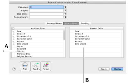 Fields in the Available Fields column are those that are available for the selected report. To include a field in a new report, select the field by clicking in the select column (