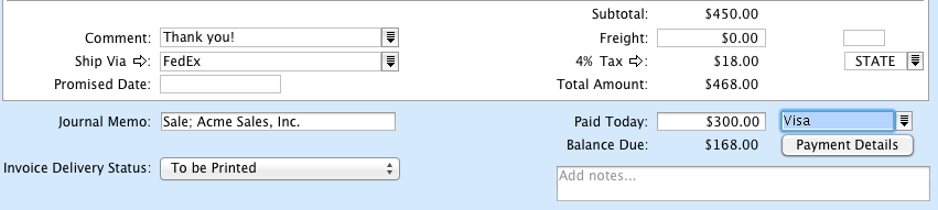 Type or select the payment method. Click Payment Details if you want to enter details about the payment. For example, if you are being paid by credit card, you can record the credit card number and expiration date.