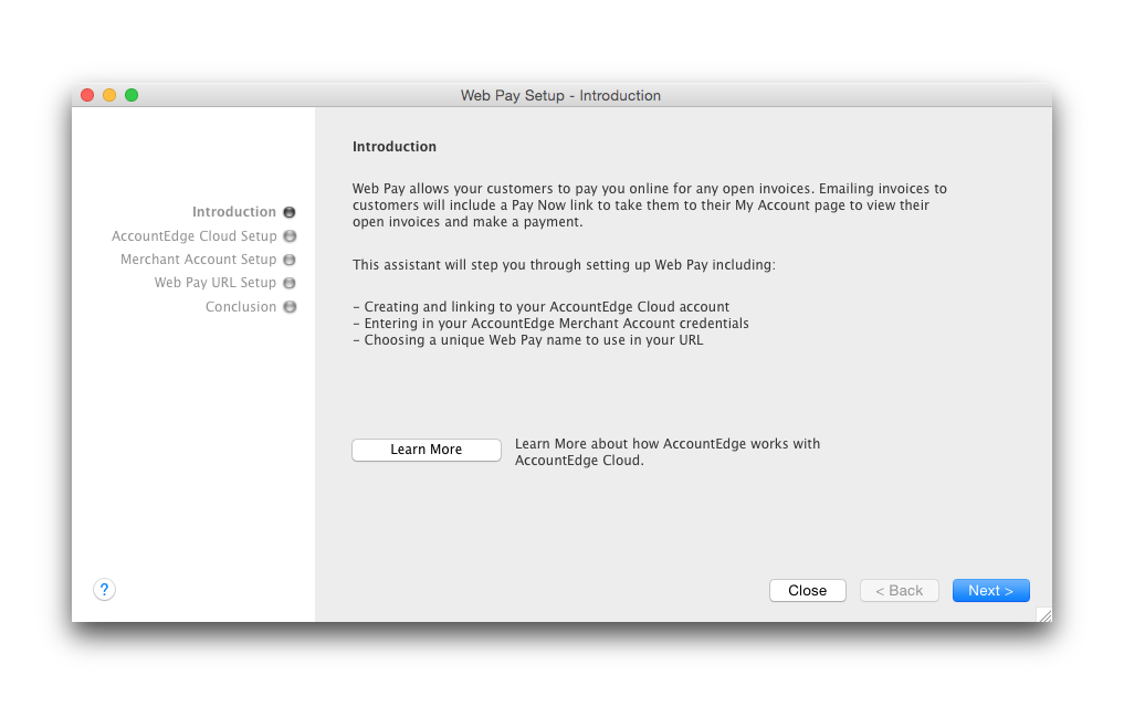 Go to the Setup menu from any command center and select Web Pay then select Web Pay Setup. The Web Pay Setup assistant appears. Click Learn More for more information on how AccountEdge works with AccountEdge Connect.