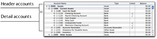 Your accounts list consists of detail accounts (the accounts to which you allocate transactions) and header accounts. Header accounts group related detail accounts to help you organize your accounts list.