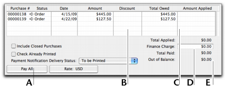 If you are settling your account in full, click Pay All. The total payment amount appears in the Amount field and the individual payment amounts are applied to each open purchase. If you take an early-payment discount for a purchase, assign the discount to the appropriate bill in this column. Note that the software will not allow you to assign a discount to a bill that you are not settling in full. If this is the case and you want to record a discount that the vendor has given you, you can create a vendor debit. See Recording and settling vendor debits. Amount Applied Type how much of the payment you want to apply to each bill in this column. Finance Charge If part of the payment was used to pay finance charges, type the finance charge amount here. Out of Balance The amount you apply in the Amount Applied column will accumulate in the Total Applied field. The Total Paid amount must equal the amount that appears in the Amount field in the top half of the window before you can record the transaction. The Out of Balance amount must be zero before you can record the transaction.