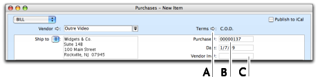 2 In the Vendor field, type or select the vendor’s name.The terms shown in the Purchases window are the terms recorded in the vendor’s card.