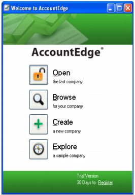 The Welcome Window has a new look and now supports Apple Command key functions.Select Open to open the company file that was opened last. You can also use Crtl-O key combination to open the last company file.Select Browse to access the Open window. You can also use Crtl-B key combination to access the Open window.Select Create to create a new company file for your business. You can also use Crtl-N key combination to create a new company file.Select Explore to explore the AccountEdge sample company file. Youc an also use Crtl-E key combination to explore the sample company.Use Crtl-X to exit the Welcome Window or simply click the red X a tthe top right corner of the window.