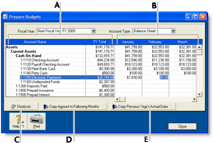 The Account Name and FY Total columns display the list of accounts and their current budget totals for the fiscal year. You can enter the budget amount for a specific account and month. You can use the horizontal scroll bar to scroll through the months. Click Shortcuts to open the Budget Shortcuts window from where you can quickly enter budget amounts for the selected account. For more information, see . Click Copy Amount to Following Months to copy the selected amount to the months that follow. Click Copy Previous Year’s Actual Data to insert the previous year’s account balances for the selected account and month.