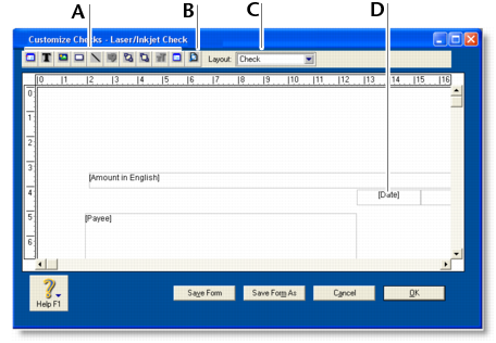 The tool palette provides you with customization tools. Select the required layout for a check stub. (Check forms only.) Data fields contain system-generated information.note : Checks have two partsA check form has two parts: the check itself and the stub. You customize the check and the stub separately. In the check Customize window, select the appropriate stub layout in the Layout field. For example, the Regular layout is assigned to checks recorded in the Spend Money window and the Payable layout is assigned to checks recorded in the Pay Bills window.