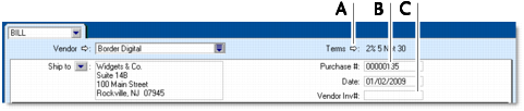 2 In the Vendor field, type or select the vendor’s name.The terms shown in the Purchases window are the terms recorded in the vendor’s card.