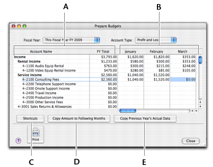 You can use the Prepare Budgets window to enter budget amounts for each month of the current or next fiscal year. If you want to quickly enter budget amounts for a group of months, you can use the Budget Shortcuts window.