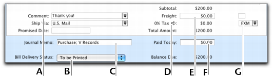 The fields that appear at the bottom of the Purchases window differ, depending on the type of purchase you are creating.