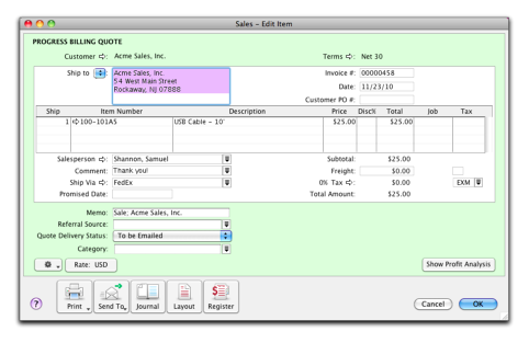 Progress Billing enables you to create an invoice from a quote by billing your customer for a percentage of the original quote or a quantity, rate, or amount for each line item.