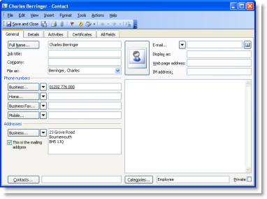 If you want to import your contacts to AccountEdge cards from the default Outlook contacts folder, type the card type for each contact in the Categories field of the General tab.