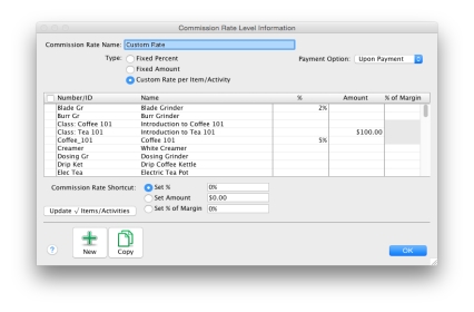Click OK to accept the changes and close the window. The Commission Rate Levels window reappears displaying the rates you created.