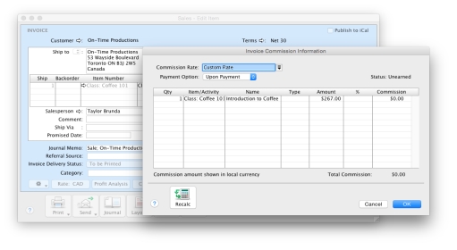 Click the percentage symbol to access the details of the calculated commission. The Invoice Commission Information window appears. The Commission column is the only amount that can be edited in this window. If the amount in this column is changed an asterisk will appear next to the new amount. To return to the original calculation, click the Recalc button.