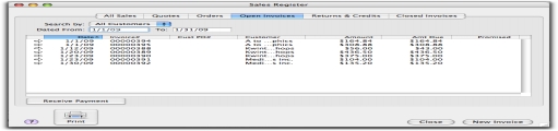 The Sales Register window lists all open and closed invoices, quotes, orders, returns and credits, and recurring templates. You can also view a list of all sales.