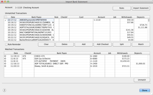 We recommend you finish adding or matching every transaction in the unmatched transaction list before you click Done. If you re-open the statement file, the original list of unmatched transactions reappears in the Unmatched Statement Transactions window.