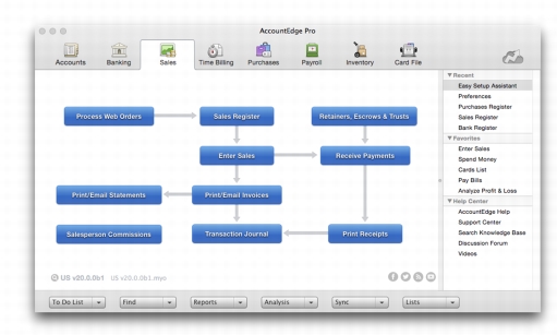 The selected icon represents the current command center, and the flowchart displayed below the icons illustrates the major tasks associated with that command center. (For example, when the Sales icon is selected, tasks such as Enter Sales and Print/Email Statements—typical tasks you would complete in relation to sales—appear in the command center’s flowchart.)