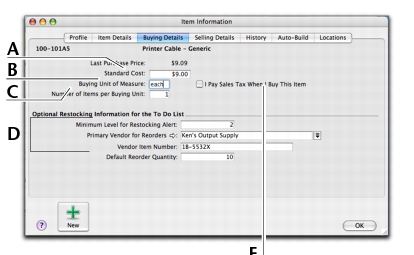 Click the Buying Details tab. The Buying Details view of the Item Information window appears. Complete the fields as explained below.