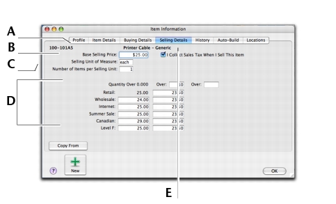 Click the Selling Details tab. The Selling Details view of the Item Information window appears. Complete the fields on this tab as explained below.