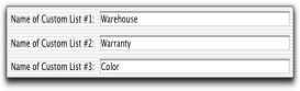 An example of a custom list is Color, in which you create list entries of ‘yellow,’ ‘red,’ ‘green’, and ‘blue.’ When you create or edit your items, you can assign them one of these colors. When you run an inventory report, such as the Analyze Inventory Summary report, you can choose to include only ‘red’ items in the report.