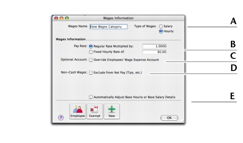 If you select Hourly as the type of wages, the Pay Rate fields appear. Select Regular Rate Multiplied by and enter, for example, 2 for double time or 1.5 for time and a half. This will multiply the employee’s Hourly Base Pay (entered in the Payroll Details tab view of their card) by this amount. Alternatively, you can enter a fixed hourly rate. This dollar amount per hour will be the same for each employee regardless of their hourly base pay.