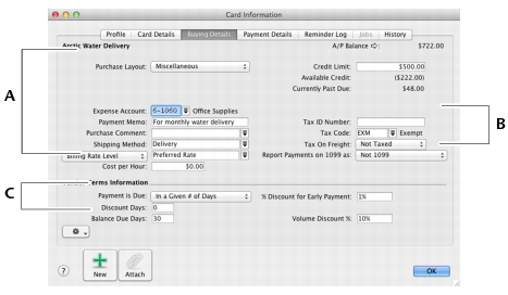 Click the Card Details tab. You can enter notes about the vendor, insert a picture, and assign attributes to group and sort the card. You can also assign a commission rate to the card.