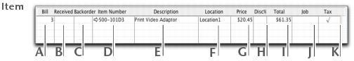 One row in the scrolling list is one line item of the transaction. You can enter as many line items for a purchase as you want. The fields that appear in the scrolling list differ according to the type of purchase you are creating.