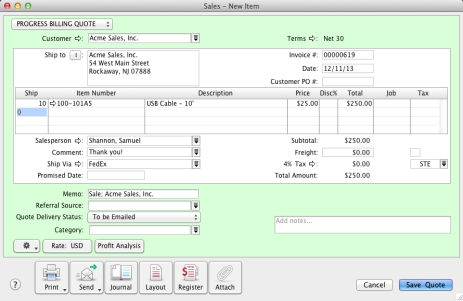 Progress Billing enables you to create an invoice from a quote by billing your customer for a percentage of the original quote or a quantity, rate, or amount for each line item.