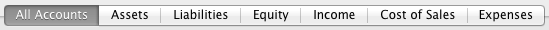 Some lists are divided into separate views using tabs. For instance, the accounts list is divided by account type into eight views (using eight tabs), making it easier for you to find an account. For example, if you are looking for an asset account, click the Asset Assets tab. Within the tab you can use the scroll bar to find the account.