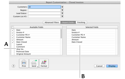 Fields in the Available Fields column are those that are available for the selected report. To include a field in a new report, select the field by clicking in the select column (