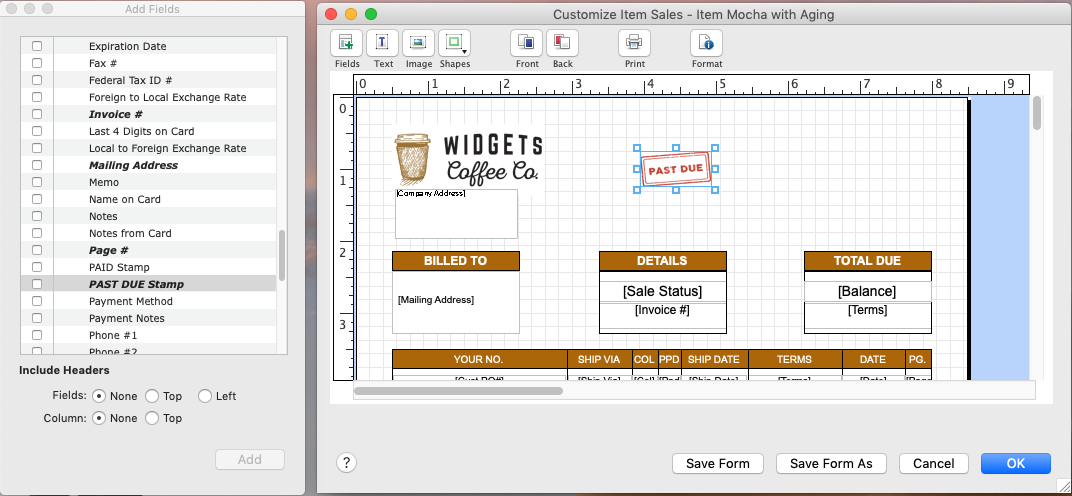 A new custom field called Past Due Stamp is available on your sales forms. Similar to how the Paid Stamp field operates, when you add this field to your form, when you go to print or email an invoice, the new Past Due stamp image will appear on the form if the sale is overdue according to the terms you have set up for the customer. This is a great way to resend invoices when they are overdue to let the customer know they need to make a payment.