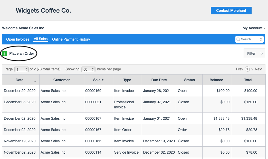 When customer who is setup to place sales orders logs into the Customer Portal, they will see a Place an Order option on the All Sales tab.