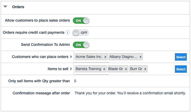 After enabling this setting in AccountEdge Connect, you'll be able to set which Items are available to customers, which customers are permitted to place sales orders, require a credit card payment as well as other options.