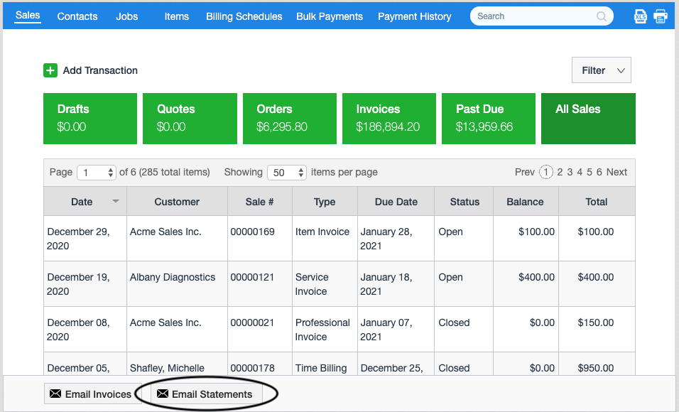 From AccountEdge Connect you can send customer statements to a group of selected customers. You have the option to email just those with overdue balances or overdue by a chosen number of days.
