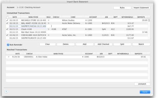 We recommend you finish adding or matching every transaction in the unmatched transaction list before you click Done. If you re-open the statement file, the original list of unmatched transactions reappears in the Unmatched Statement Transactions window.