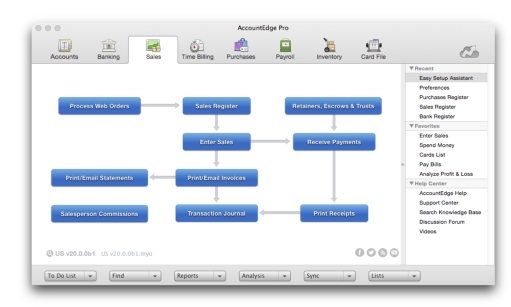 The selected icon represents the current command center, and the flowchart displayed below the icons illustrates the major tasks associated with that command center. (For example, when the Sales icon is selected, tasks such as Enter Sales and Print/Email Statements—typical tasks you would complete in relation to sales—appear in the command center’s flowchart.)