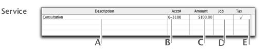 The scrolling list in the middle of the Purchases window is where you enter details of what you are buying. In this area, you will enter item numbers, descriptions, account numbers (or account names, depending upon your selection in the Preferences window), and other information about your transaction.