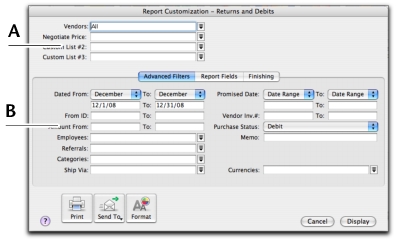 Filter the report by making the required entries and selections in the toolbar that appears in the top section of the Report Display window. (Some reports do not have selection options.)