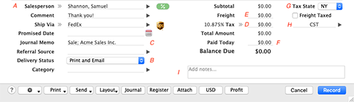 The fields that appear at the bottom of the Sales window depend on the type of sale you are creating.