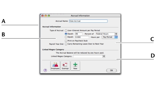 Paying your employees > Creating payroll categories > Accrual Information window